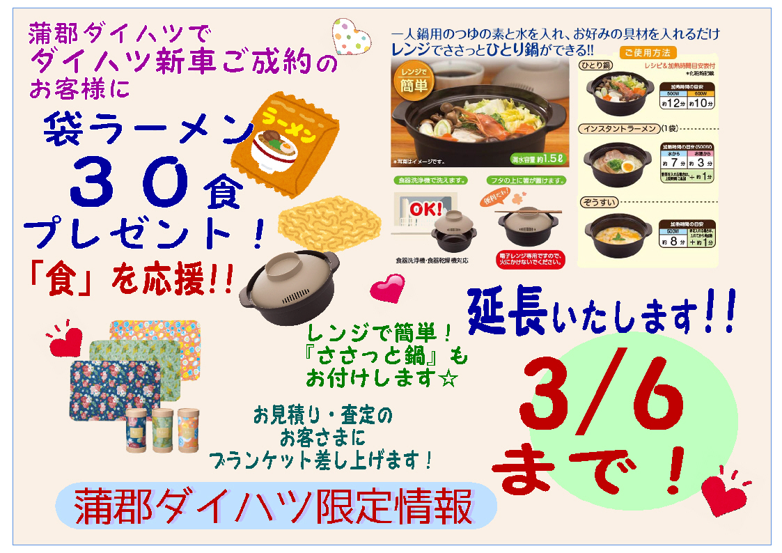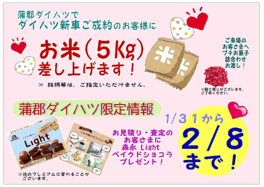 【期間】2026年1月31日㊏~2月8日㊐ 蒲郡ダイハツにてダイハツ新車をご成約のお客様に、🎁お米(5kg)差し上げます […]