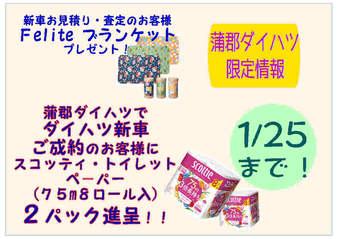 【期間】2026年1月17日㊏~1月25日㊐ 蒲郡ダイハツにてダイハツ新車をご購入いただけると、🎁スコッティのトイレット […]